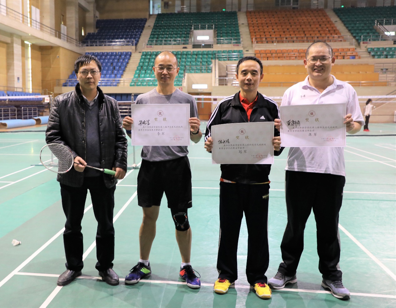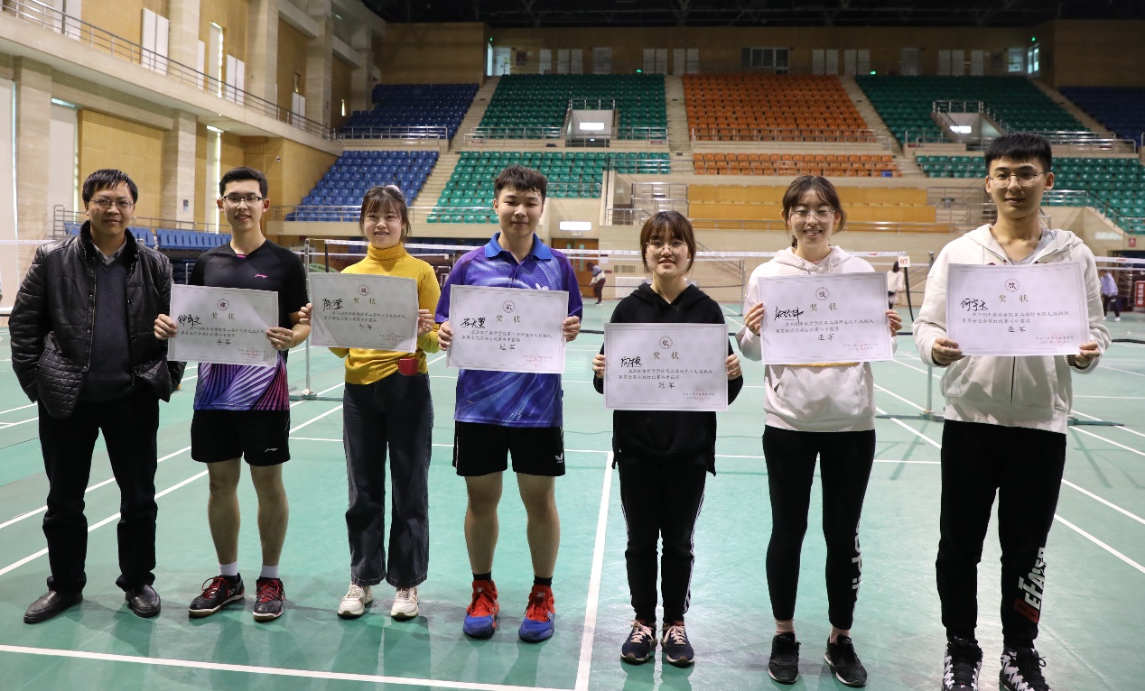 挥汗如雨间,比赛接近尾声。最终,倪天佳老师和向桢同学分别夺得男子单打和女子单打的冠军,龚新奇老师和朱晓宝老师一起摘得男双桂冠,向桢同学和石天奥同学合力拿下混双冠军,全体参赛师生的表现得到了大家的一致好评。最后,由黄志勇老师为各位获奖选手颁奖并合影,本次比赛圆满结束。比赛结果如下:
