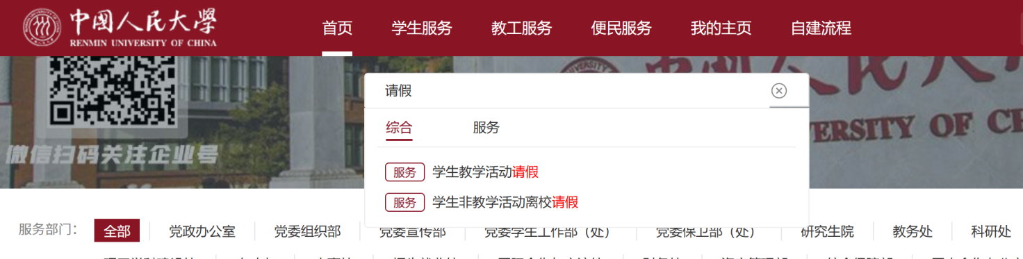2.在“综合服务中心网上办事大厅”首页搜索栏中输入“教学活动请假/非教学活动离校请假”,填写申请表单。填写时请注意逐项核对个人基本信息并填写手机号码,选择请假起止日期并附上相关证明材料。如为教学活动请假,务必核对并勾选请假课程信息。