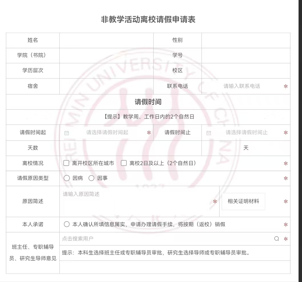 4.如同一原因需要同时办理教学活动和非教学活动请假,均需单独提交请假申请。未按要求办理请假手续或请假未获批准而擅自不参加教学活动、在教学周(不含国际小学期)内擅自离校的,将按规定给予相应纪律处理。