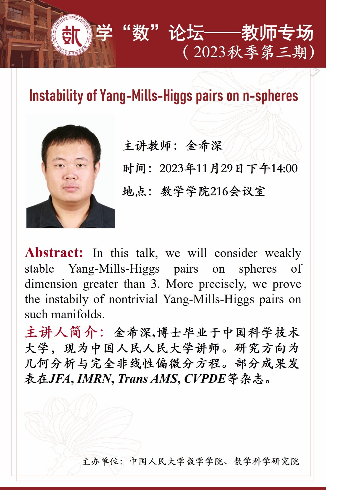 教师专场的第三期报告将于2023年11月29日下午14:00在yl7703永利216会议室举行,本场报告的主讲教师为金希深,报告题目为《Instability of Yang-Mills-Higgs pairs on n-spheres》。