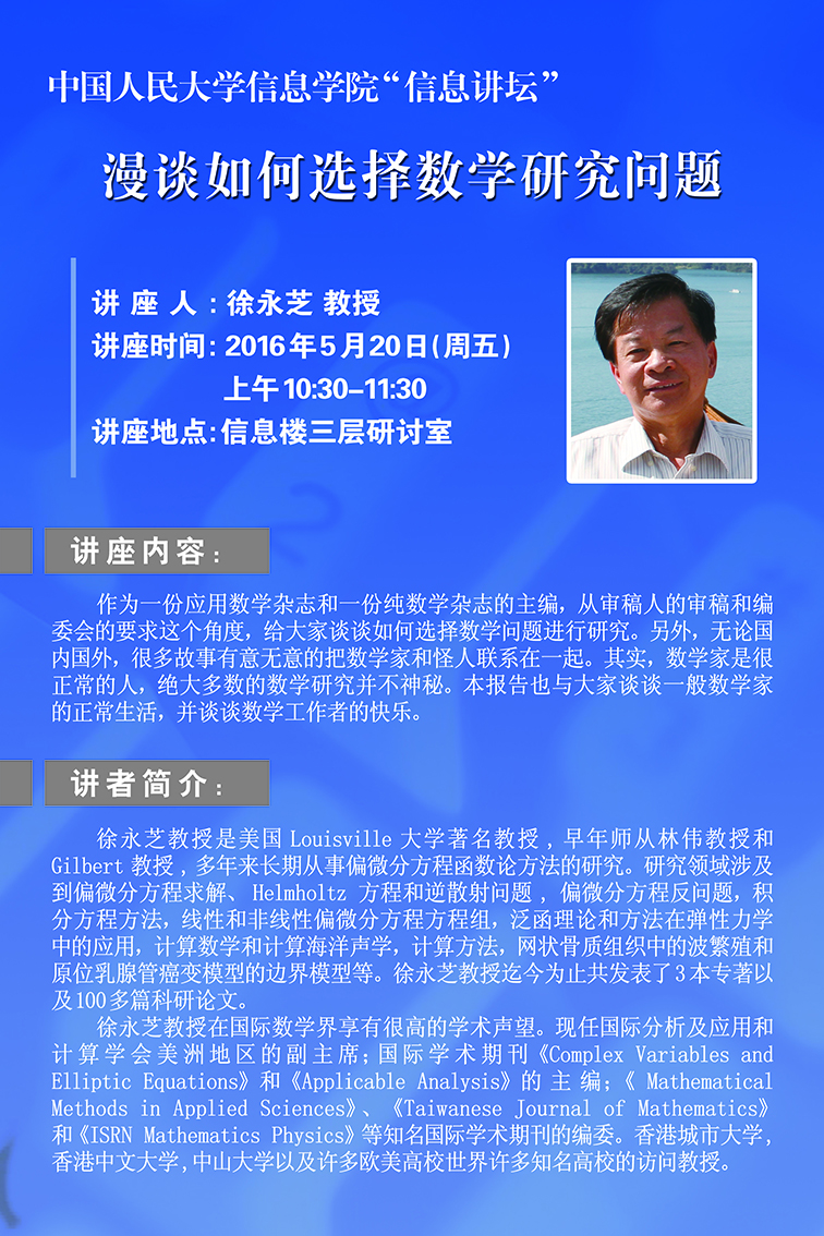 徐永芝教授是美国Louisville大学著名教授,早年师从林伟教授和Gilbert教授,多年来长期从事偏微分方程函数论方法的研究。研究领域涉及到偏微分方程求解、 Helmholtz 方程和逆散射问题, 偏微分方程反问题,积分方程方法,线性和非线性偏微分方程方程组,泛函理论和方法在弹性力学中的应用,计算数学和计算海洋声学,计算方法,网状骨质组织中的波繁殖和原位乳腺管癌变模型的边界模型等。徐永芝教授迄今为止共发表了3本专著以及100多篇科研论文。 徐永芝教授在国际数学界享有很高的学术声望。现任国际分析及应用和计算学会美洲地区的副主席;国际学术期刊《Complex Variables and Elliptic Equations》和《Applicable Analysis》的主编;《 Mathematical Methods in Applied Sciences》、 《Taiwanese Journal of Mathematics》和《ISRN Mathematics Physics》等知名国际学术期刊的编委。香港城市大学, 香港中文大学,中山大学以及许多欧美高校世界许多知名高校的访问教授。