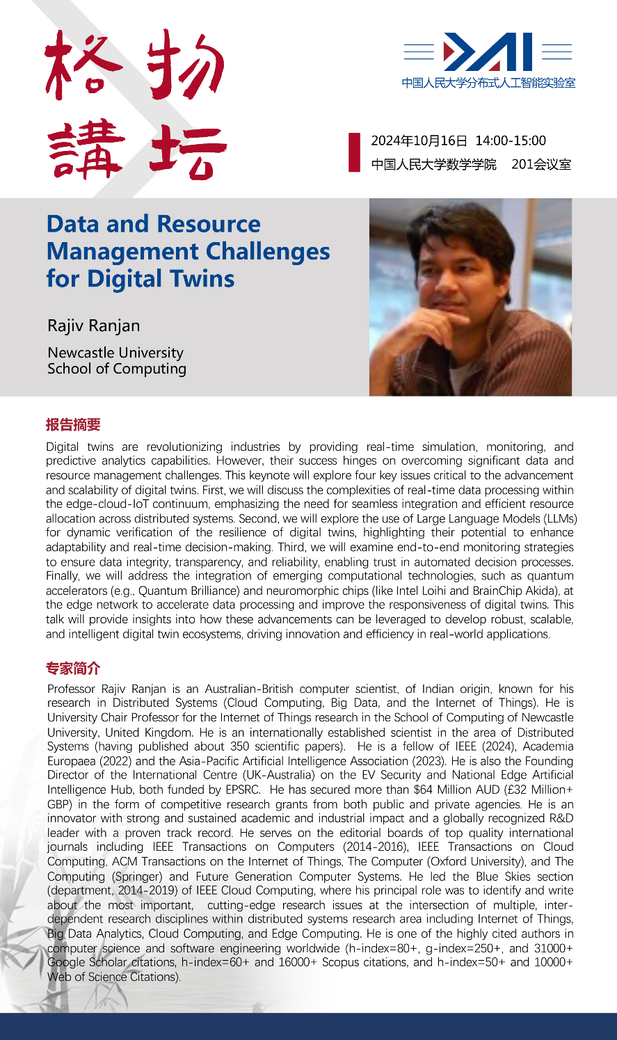 报告题目:Data and Resource Management Challenges for Digital Twins