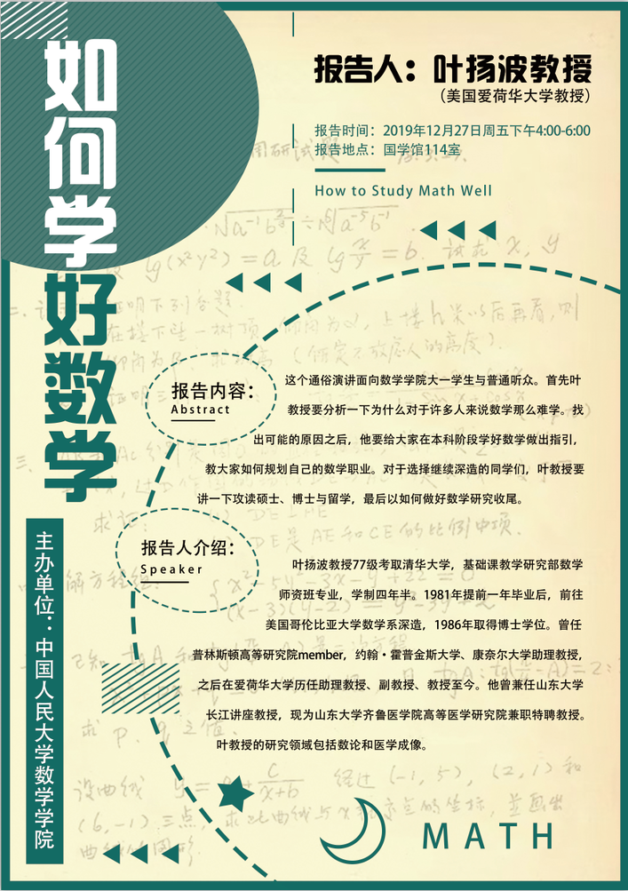 这个通俗演讲面向yl7703永利大一员工与普通听众。首先叶教授要分析一下为什么对于许多人来说数学那么难学。找出可能的原因之后,他要给大家在本科阶段学好数学做出指引,教大家如何规划自己的数学职业。对于选择继续深造的同学们,叶教授要讲一下攻读硕士、博士与留学,最后以如何做好数学研究收尾。