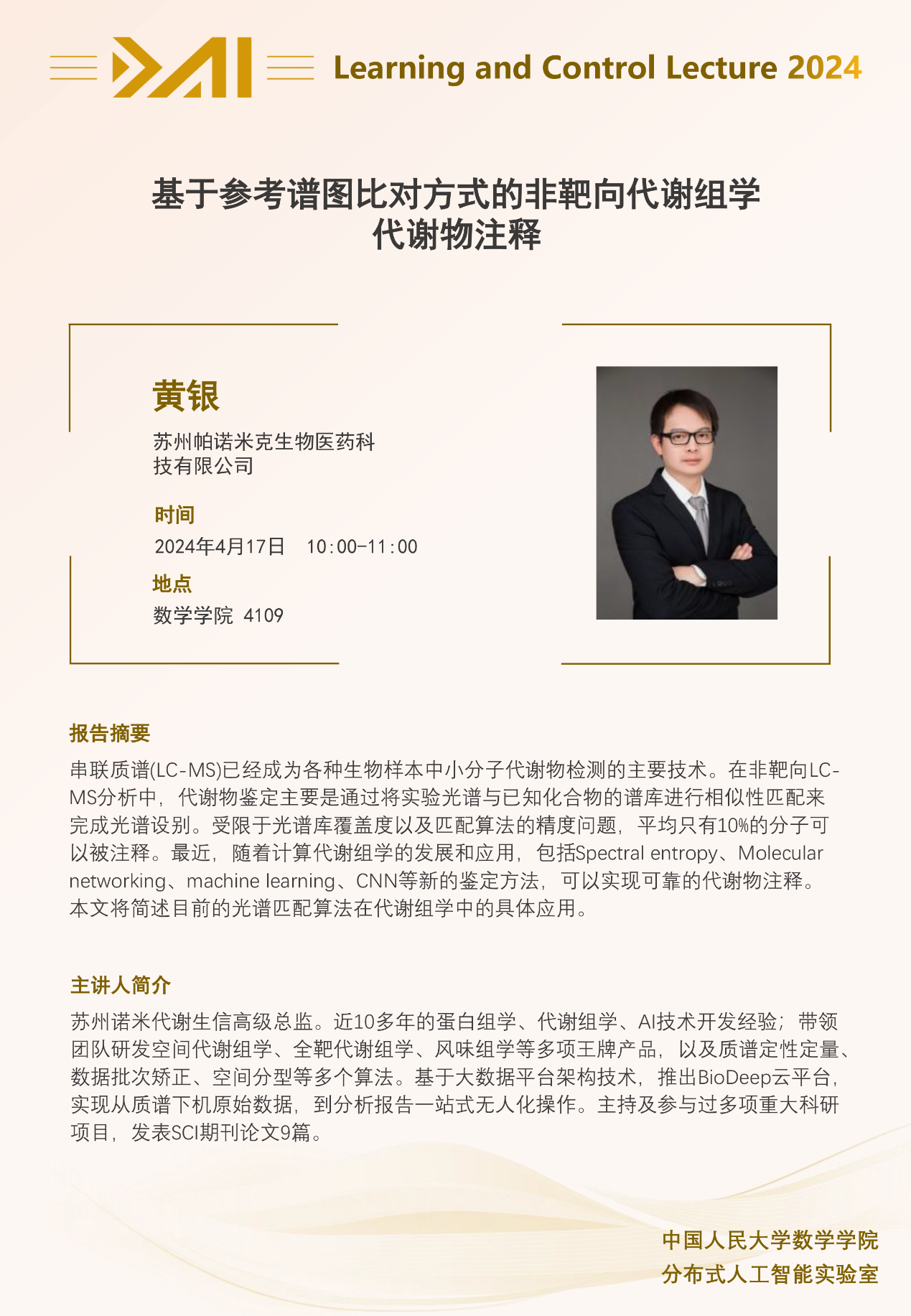 苏州诺米代谢生信高级总监。近10多年的蛋白组学、代谢组学、AI技术开发经验;带领团队研发空间代谢组学、全靶代谢组学、风味组学等多项王牌产品,以及质谱定性定量、数据批次矫正、空间分型等多个算法。基于大数据平台架构技术,推出BioDeep云平台,实现从质谱下机原始数据,到分析报告一站式无人化操作。主持及参与过多项重大科研项目,发表SCI期刊论文9篇。