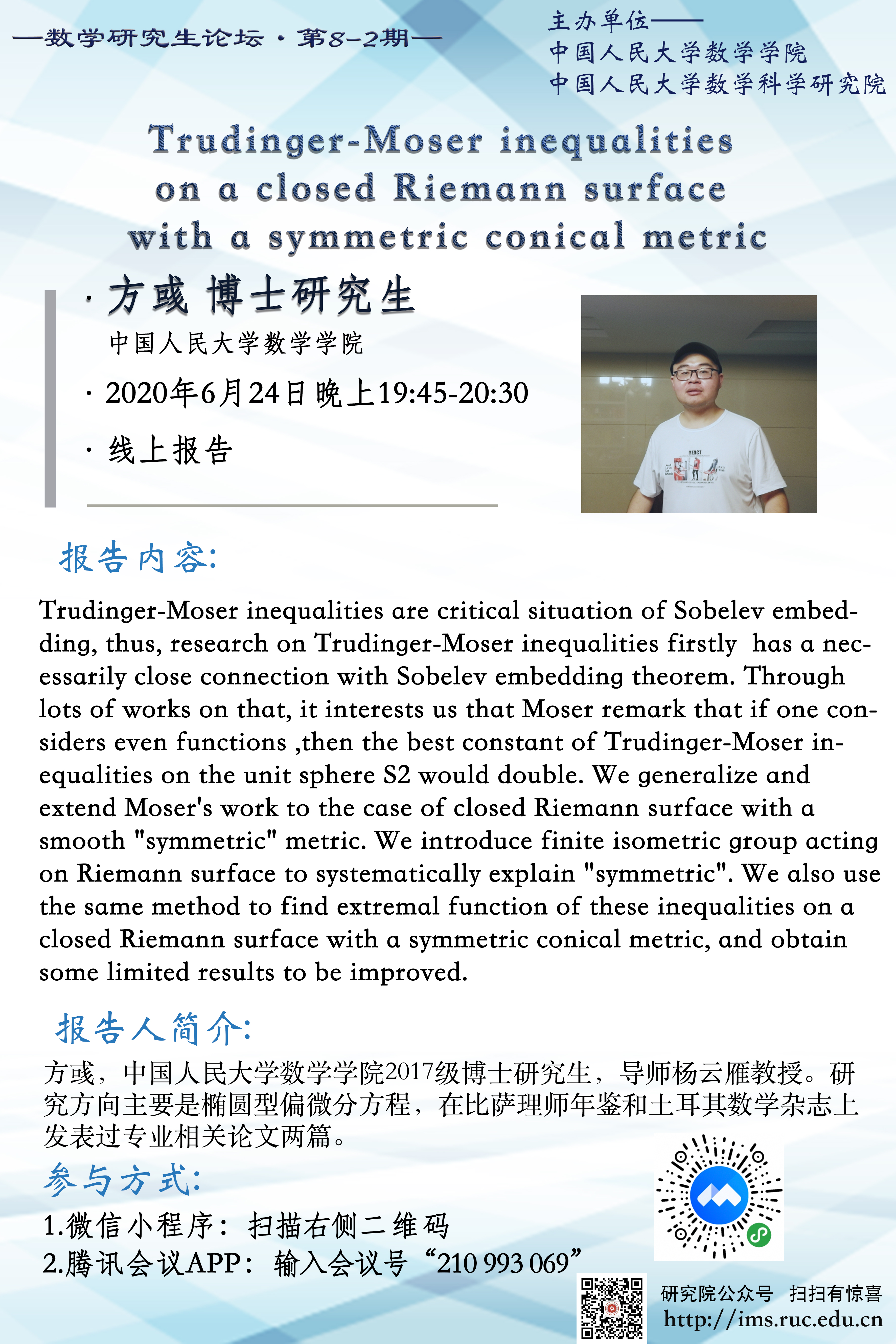 yl7703永利研究生论坛 8-2期—Trudinger-Moser inequalities on a closed Riemann surface with a symmetric conical metric