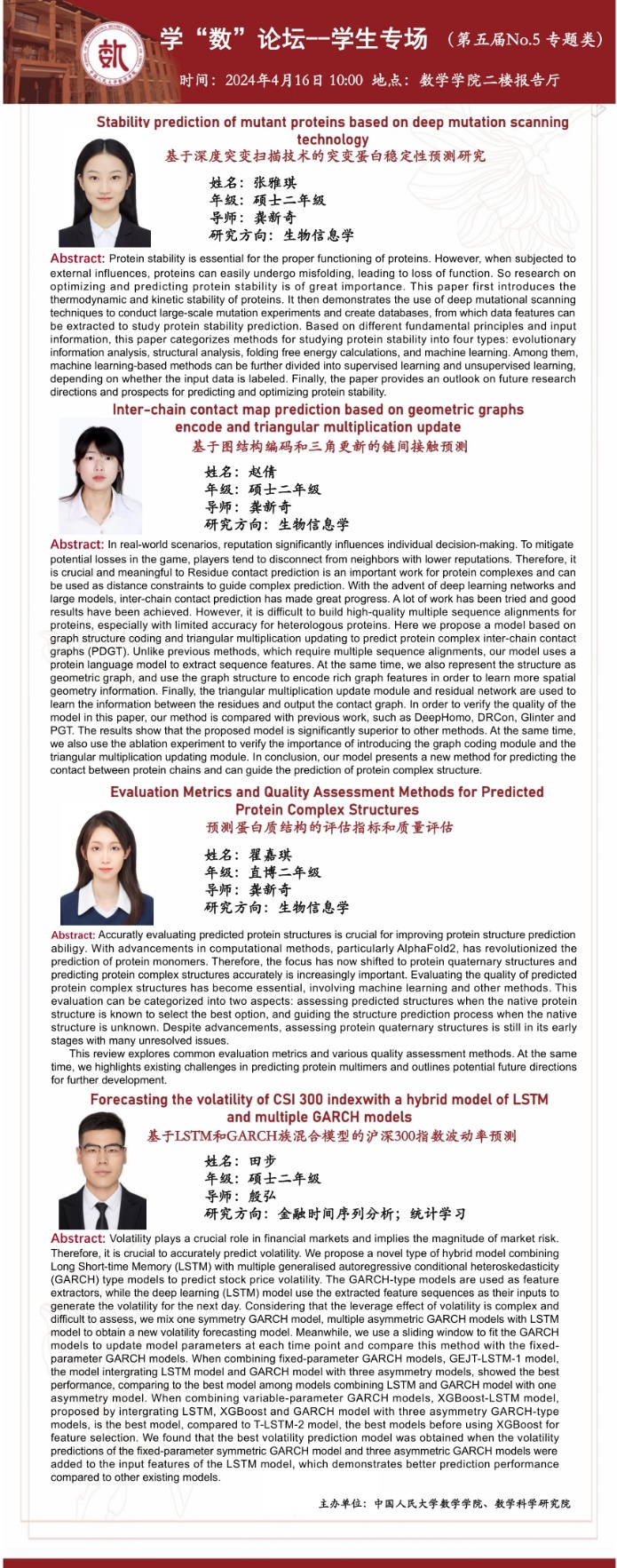大家好,本届学“数”论坛——员工专场的第二场报告来啦!本场报告类型为学术类,将于2024年4月16日10:00在yl7703永利二楼报告厅举办。主讲嘉宾为硕士二年级张雅琪同学、硕士二年级赵倩同学、直博二年级翟嘉琪同学、硕士二年级田步同学。