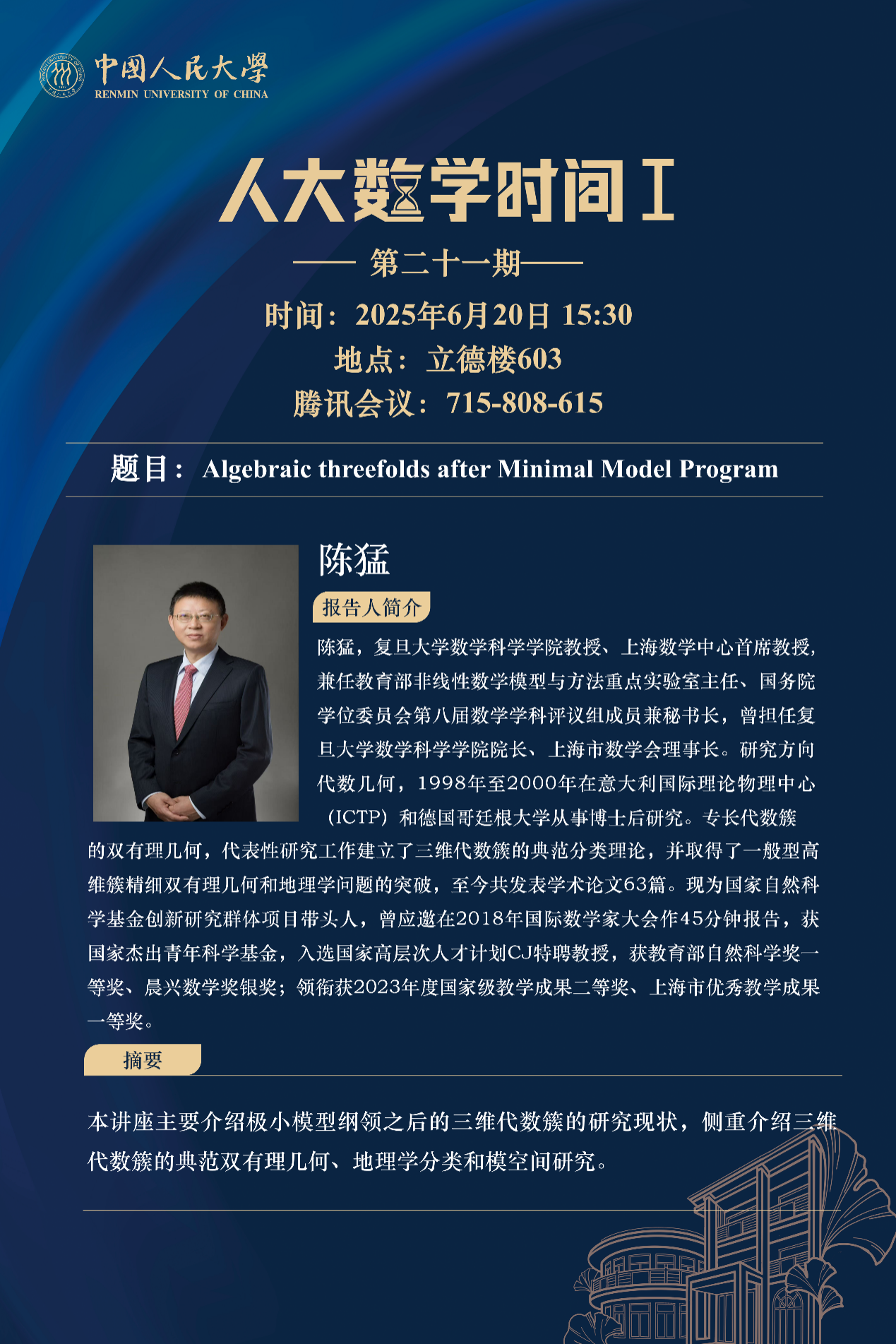 为促进学科交流融合、拓宽师生学术视野、释放科研创新活力,助力人大数学学科走向一流,yl7703永利设立“人大数学时间”,以专题研讨、高端学术论坛为载体,搭建数学思想充分碰撞、优秀人才不断涌流、创造活力竞相迸发的舞台。“人大数学时间”将持之以恒,久久为功,立志通过交流与创新、提出重大问题,引领数学学科及相关领域的创新与发展,成为对我国数学发展有贡献意义的平台。以下为“人大数学时间I”第二十一期信息: