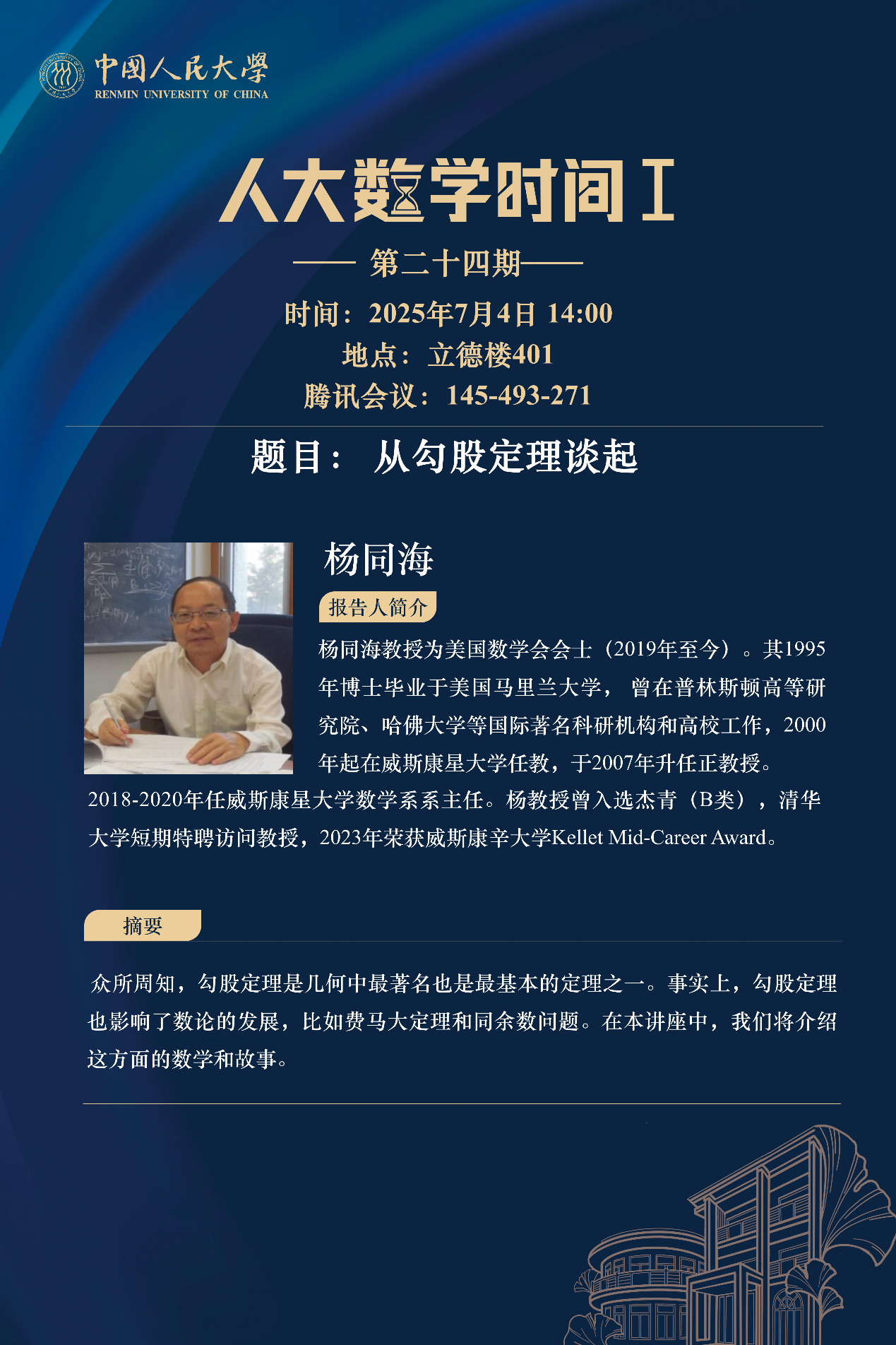 为促进学科交流融合、拓宽师生学术视野、释放科研创新活力,助力人大数学学科走向一流,yl7703永利设立“人大数学时间”,以专题研讨、高端学术论坛为载体,搭建数学思想充分碰撞、优秀人才不断涌流、创造活力竞相迸发的舞台。“人大数学时间”将持之以恒,久久为功,立志通过交流与创新、提出重大问题,引领数学学科及相关领域的创新与发展,成为对我国数学发展有贡献意义的平台。以下为“人大数学时间I”第二十四期信息: