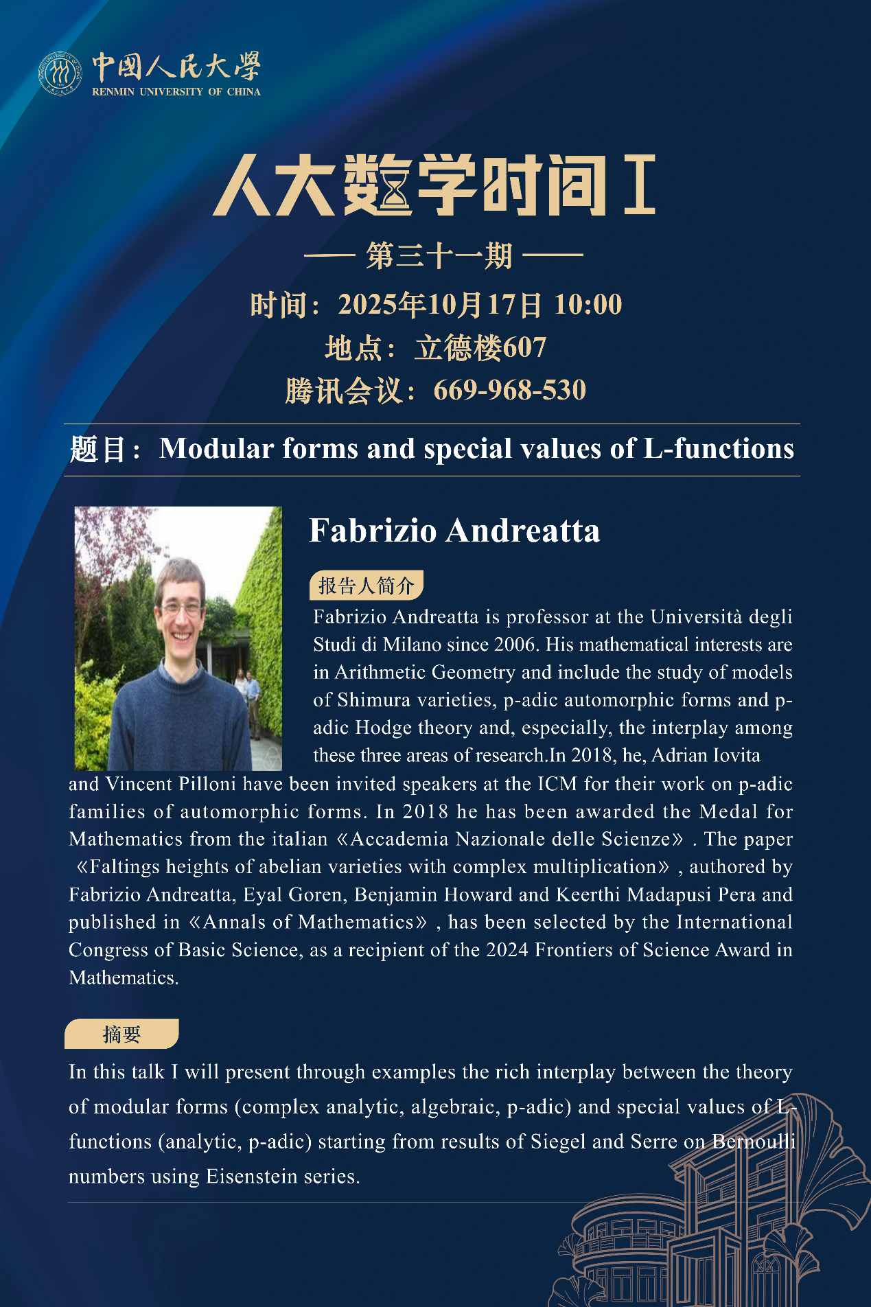 Fabrizio Andreatta is professor at the Università degli Studi di Milano since 2006. His mathematical interests are in Arithmetic Geometry and include the study of models of Shimura varieties, p-adic automorphic forms and p-adic Hodge theory and, especially, the interplay among these three areas of research. In 2018, he, Adrian Iovita and Vincent Pilloni have been invited speakers at the ICM for their work on p-adic families of automorphic forms. In 2018 he has been awarded the Medal for Mathematics from the italian《Accademia Nazionale delle Scienze》. The paper 《Faltings heights of abelian varieties with complex multiplication》, authored by Fabrizio Andreatta, Eyal Goren, Benjamin Howard and Keerthi Madapusi Pera and published in《Annals of Mathematics》, has been selected by the International Congress of Basic Science, as a recipient of the 2024 Frontiers of Science Award in Mathematics.