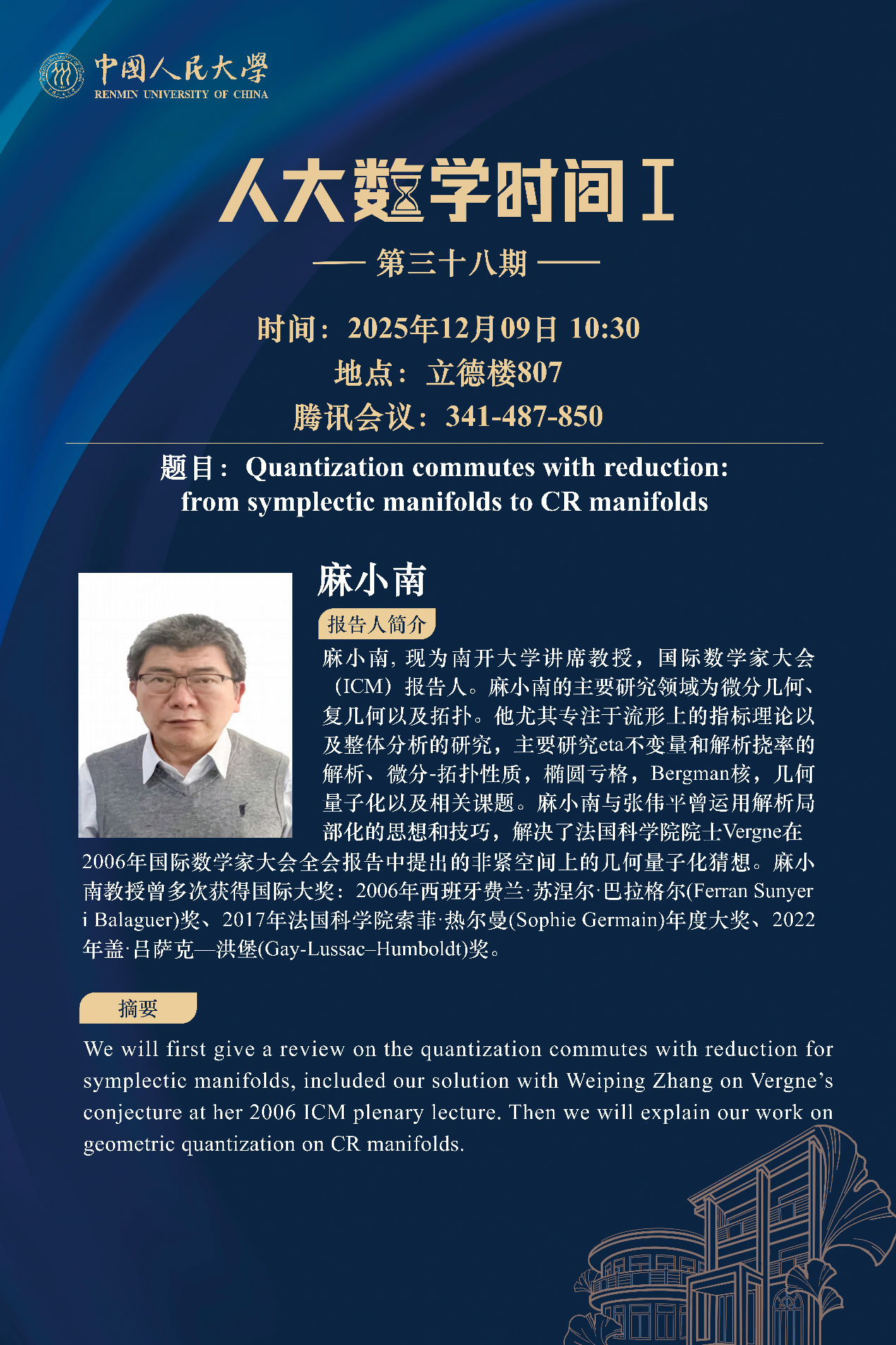 为促进学科交流融合、拓宽师生学术视野、释放科研创新活力,助力人大数学学科走向一流,yl7703永利设立“人大数学时间”,以专题研讨、高端学术论坛为载体,搭建数学思想充分碰撞、优秀人才不断涌流、创造活力竞相迸发的舞台。“人大数学时间”将持之以恒,久久为功,立志通过交流与创新、提出重大问题,引领数学学科及相关领域的创新与发展,成为对我国数学发展有贡献意义的平台。以下为“人大数学时间I”第三十八期信息: