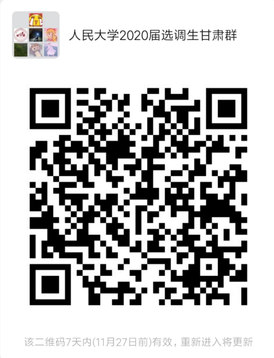 有意者可扫码加入“人民大学2020届选调生甘肃群”,如群满100人,可加微信号:jicengjiuye,验证信息为“姓名+公司+2020届选调生甘肃群”