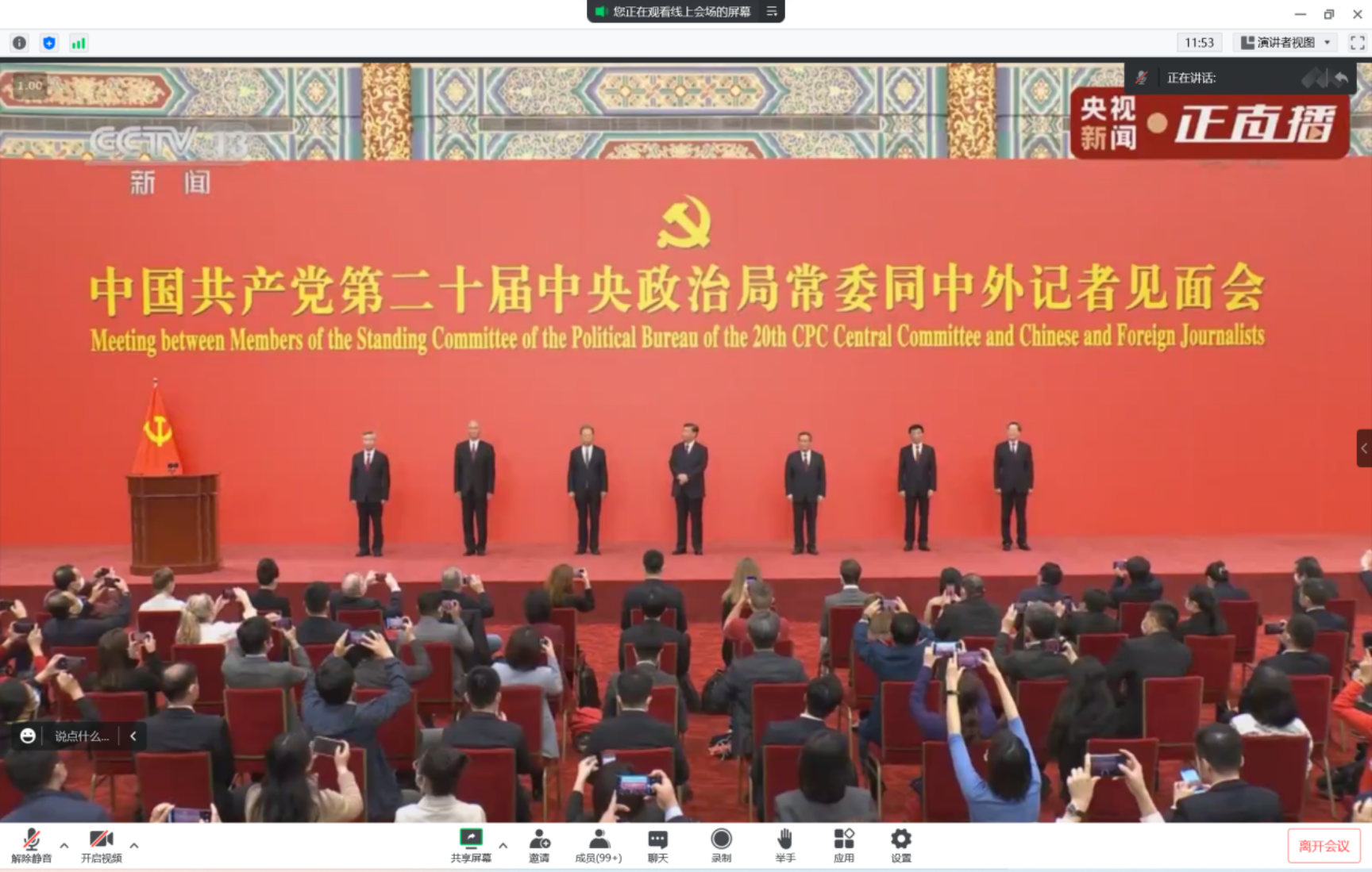 2022年10月23日上午,中国共产党第二十届中央委员会举行了第一次全体会议,选举习近平、李强、赵乐际、王沪宁、蔡奇、丁薛祥、李希七位同志为新一届中央政治局常委。在中外记者见面会上,习近平总书记以饱满的热情同中外记者讲述了中国的美好蓝图。我在yl7703永利,与理论中心组成员及师生党员集体一同收看了记者见面会。从习总书记走出来的那一刻,内心的激动一直不能平复。