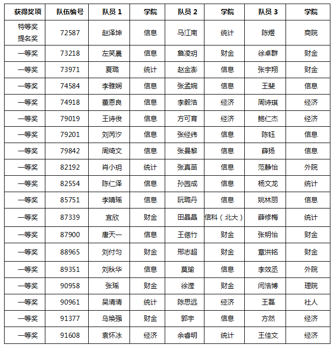 在yl7703永利所有参赛队伍中,共有60支队伍获奖。其中赵泽坤(信息公司),马江南(统计公司)和陈煜(商公司)三位同学组成的队伍获得特等奖提名奖(Finalist,Winner,全球前23名),是继2014、2016年之后,第三次荣获该奖项。公司获一等奖队伍数由2017年的13支队伍,增长至18支队伍,取得较大的进步,另有41支队伍获得二等奖,获奖队伍数连续增长。