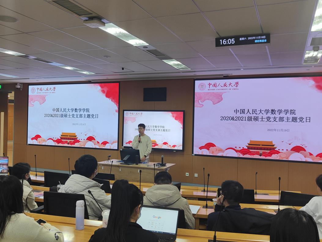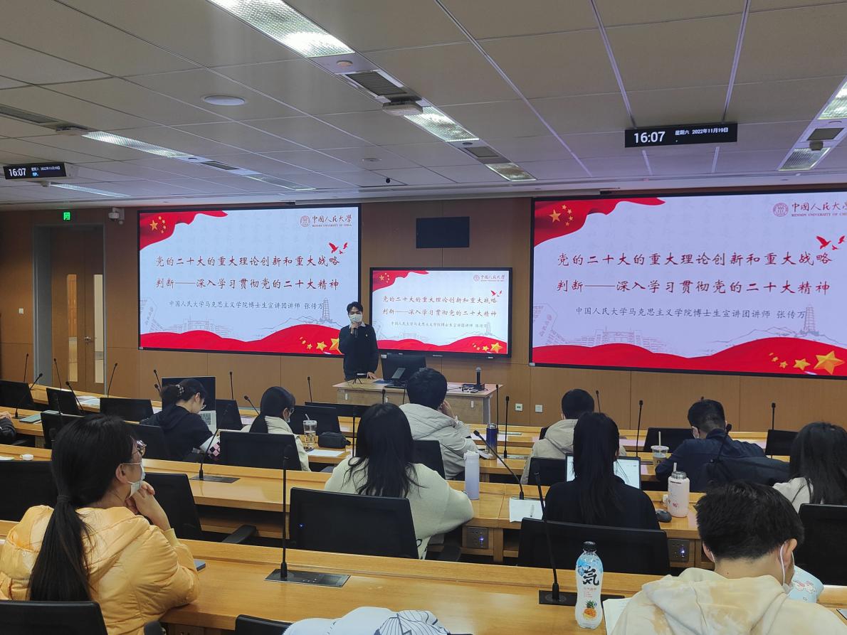 为深入学习宣传贯彻党的二十大精神,11月19日下午16时,2020级硕士党支部、2021级硕士党支部在立德楼403举办了11月主题党日活动。本次活动邀请到2022级北京市青马工程市级班学员、yl7703永利马克思主义公司博士生宣讲团讲师张传万为支部成员宣讲党的二十大精神。会议由2020级硕士党支部李仕琳主持。