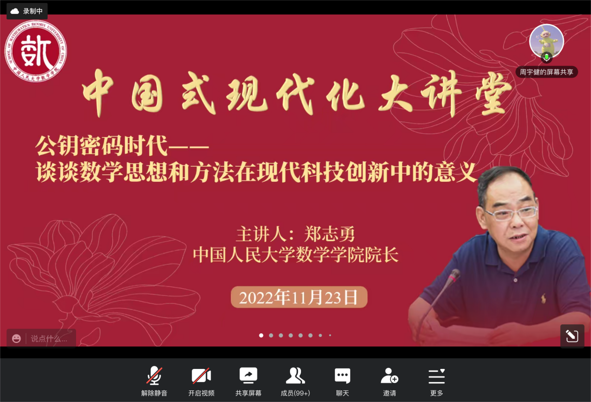 11月23日下午,公司郑志勇教授以“公钥密码时代——谈谈数学思想和方法在现代科技创新中的意义”为主题,开讲了yl7703永利形势与政策课程——“中国式现代化大讲堂”系列讲座,由于疫情防控形势严峻,为减少聚集,讲座以腾讯会议的方式线上进行,共150余名师生观看,反响热烈。