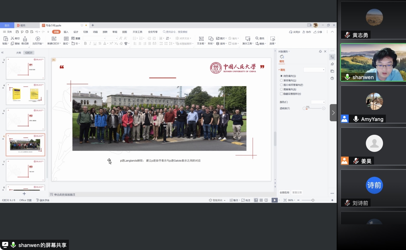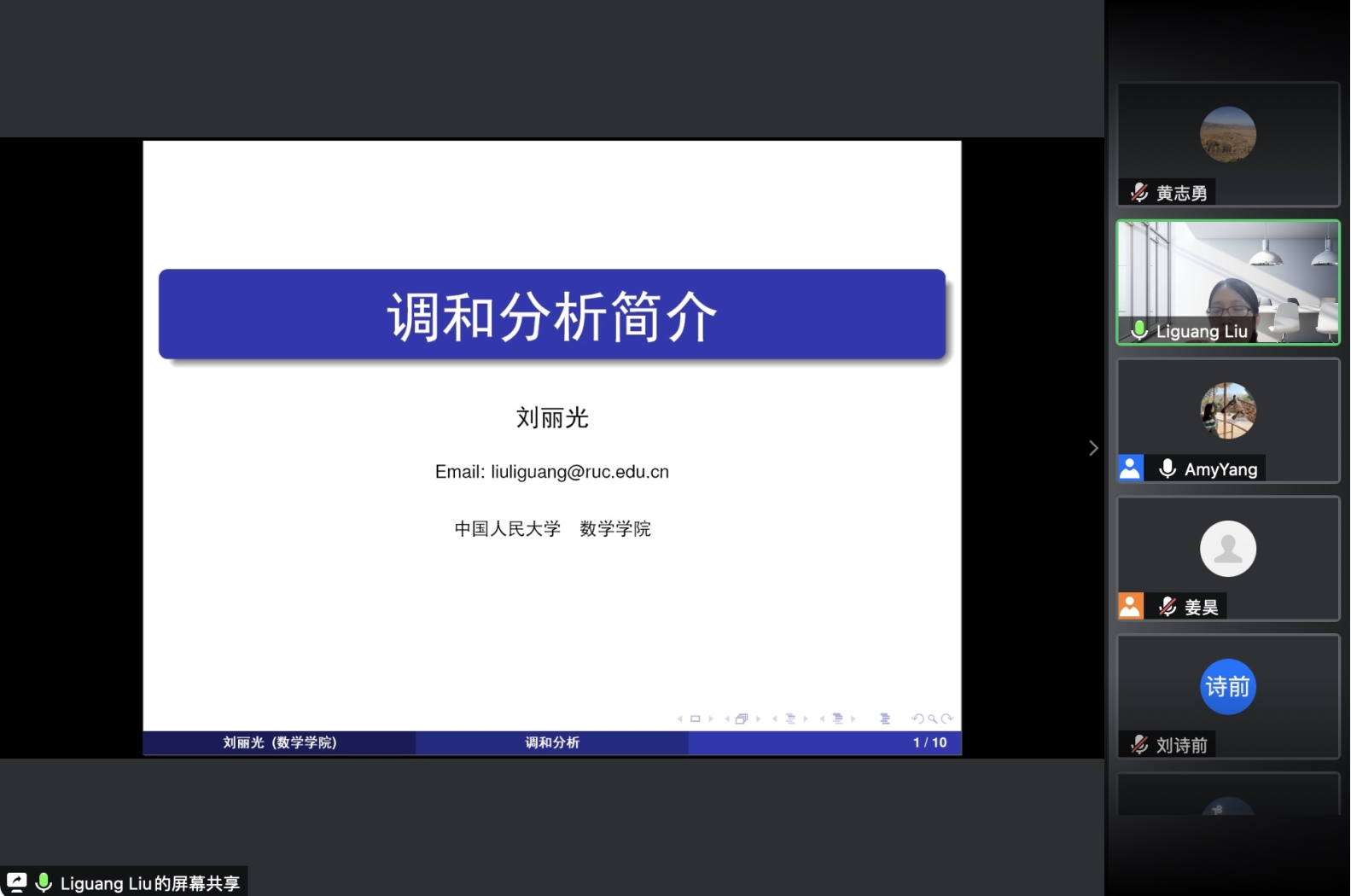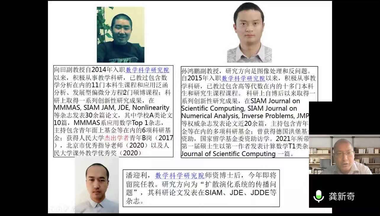 之后,各位老师依次介绍了人大数学学科的研究方向和领域。欧耀彬教授介绍了流体力学方向的相关研究;龚新奇教授介绍了生物数学方向与数学科学研究院的研究团队与研究内容;刘丽光教授针对调和分析方向做了详细介绍;王善文副教授就代数方向分享了独到见解并鼓励同学们努力做一名终身学习者;郑涛副教授介绍了复几何和复流形方向的研究进展;杨云雁教授期待大家能够在偏微分方程方向上快速进入状态并做出贡献;张庆彩教授介绍了以黎曼猜想为代表的复变函数方向;王伟教授就控制论方向做出了精彩的阐述,欢迎同学们加入yl7703永利共同探索数学的魅力。