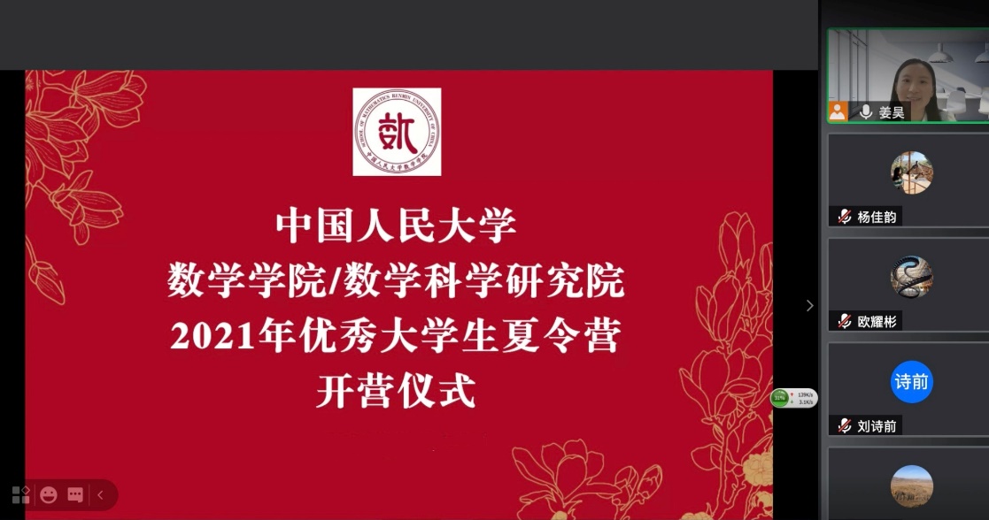 姜昊老师对各位夏令营营员表示了热烈的欢迎,并向同学们介绍了出席仪式的各位领导和老师。她表示,基于疫情的影响,本次夏令营虽然在线上开展,无法让同学们相聚人民大学,但相信老师和同学们的热情和沟通质量不会受到任何影响。姜老师表达了对全体营员的殷切期望和美好祝愿。